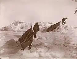 Экспедиция отправилась в путь 2 мая 1888 года. Нансен вместе с пятью товарищами через Данию, Шотландию и Исландию добрался до восточного побережья Гренландии. 17 июля произошла высадка на плавучие льды в 20 км от побережья[66]. Ценой огромных усилий группа на лодках прошла сквозь плавучие льды и достигла побережья 17 августа. Первоначально поход намечался от фьорда Сермилик, но фактически экспедиция стартовала южнее, из бухты Умивик. Дальнейшее продвижение осуществлялось на лыжах через неизвестную территорию, тягловой силой служили сами люди (на каждого приходилось более 100 кг груза)[67]. Морозы достигали −40 °C, шерстяная одежда плохо защищала от холодов, а в рационе почти не оказалось жиров (Свердруп даже просил у Нансена выдать в пищу сапожную мазь на основе льняного масла)[68]. 3 октября 1888 года экспедиция достигла западного побережья, совершив первый переход через льды Гренландии на дистанцию около 470 км. Во время всего путешествия Нансен и его спутники вели метеорологические наблюдения и собирали научные материалы[69].