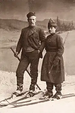 С Евой Хеленой Сарс (1858—1907) Нансен случайно встретился на лыжной прогулке в феврале 1888 года. Ева Сарс была дочерью (20-м ребёнком[81]) известного в Норвегии зоолога — священника Микаэля Сарса (1805—1869) и Марен Катрин Вельхавен (1811—1898), сестры известного поэта Йохана Себастьяна Вельхавена[82]. Ева была к тому времени знаменитой камерной певицей (меццо-сопрано), исполнительницей романсов[82], в 1886—1887 годах училась в Берлине у Дезире Арто[83]. Помимо музыки, Ева Сарс увлекалась живописью, а также спортом. Любительница лыжного спорта, она изобрела женский лыжный костюм, по образцу саамского[84]. Вторая встреча Евы с Нансеном произошла в Музыкальном кафе в Кристиании незадолго до его отъезда в Гренландию.