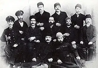 Театральная любительская труппа Габиб-бека Махмудбекова, 1898 год. На фото Н. Нариманов (лежит справа) в черкеске.