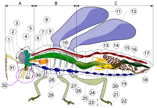 Тело насекомых подразделяется на три сегментированных отдела: голова, грудь и брюшко[33][34]. Каждый сегмент подразделяется на четыре части — верхнее полукольцо называется тергит, нижнее полукольцо называется стернит, боковые стенки — плейриты. При обозначении взаимного расположения частей тела и органов термином «дорсальный» (dorsalis) обозначают верхнюю сторону тела, а «вентральный» (ventralis) — нижнюю сторону. Выделяют также мезосому (у муравьёв из трёх грудных сегментов и первого абдоминального сегмента проподеума) и метасому (стебелёк и брюшко).