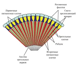 Основой головы является черепная коробка (epicranium). Внутри неё есть особая скелетная структура — тенториум. На голове различают переднюю поверхность — лоб (frons), который сверху переходит в темя (vertex) и далее назад — в затылок (occiput). Спереди ото лба лежит хорошо обособленная пластинка — наличник (clypeus), далее вперёд (вниз) — верхняя губа (labrum), подвижный пластинчатый кожный выступ, прикрывающий сверху ротовые органы. На боках головы, под глазами, различают щёки (genae), сзади переходящие в виски (tempora), а снизу лежит горло (gula). С боков головы расположены фасеточные глаза (oculi), состоящие из множества зрительных единиц — омматидиев — и являющиеся основными органами зрения. Они характерны почти для всех взрослых насекомых и личинок насекомых с неполным превращением. Вторичное их исчезновение отмечается у блох и веерокрылых. Кроме этого, между сложными глазами обычно расположено от одного до трёх простых глаз, или глазков (ocelli). В зависимости от биологии положение головы неодинаково. Различают гипогнатическую голову (caput hypognathum) — с ротовыми органами, обращёнными вниз, подобно ногам, — и прогнатическую голову (caput prognathum) — с ротовыми органами, обращёнными вперёд. Первый тип обычно характерен для растительноядных, а второй — для хищных насекомых. Усики находятся по бокам лба, между глазами или впереди них, нередко в обособленной усиковой впадине. Они очень разнообразны, характерны для разных групп насекомых. В своей основе усики состоят из утолщённого основного членика, называемого рукояткой (scapus), за которым следует ножка (pedicellus) и, начиная с третьего членика, располагается основная часть — жгутик (flagellum). Различают несколько типов усиков[33].