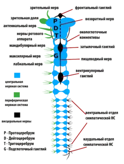 Голова (caput) внешне нечлениста, но эволюционно произошла путём слияния пяти сегментов тела и акрона в процессе олигомеризации тела. Сохранившимися конечностями этих сегментов являются усики, или антенны первые (antennae), и 3 пары ротовых конечностей — нечленистые верхние челюсти, или мандибулы (mandibulae), членистые нижние челюсти, или максиллы (maxillae), и членистая, внешне непарная нижняя губа (labium), являющаяся второй парой нижних челюстей, слившихся между собой. Различают несколько типов ротовых органов, из которых первичным является грызущий, предназначенный для разрывания и поглощения относительно твёрдой пищи. В процессе эволюции возникло несколько модификаций данного исходного типа, которые у разных групп насекомых устроены по-разному. В одних случаях питание связано с проколом пищевого субстрата — колюще-сосущий ротовой аппарат (клопы, тли, цикады, комары и др.), в других приём пищи не сопровождается проколом — трубчато-сосущий тип — у большинства бабочек[33]. Грызуще-лижущий тип приспособлен к питанию жидкой пищей и характерен для ос и пчёл. Особую модификацию представляет мускоидный тип ротового аппарата, возникший у мух и приспособленный к потреблению как жидкой, так и твёрдой пищи. Другой путь развития исходного ротового аппарата наблюдается у скрыточелюстных, нижняя губа которых слилась с т. н. оральными складками, образовав парные челюстные карманы, в которые погружены мандибулы и максиллы. Существует также множество других типов, которые нередко представляют собой переходные формы между вышеописанными типами[33].
