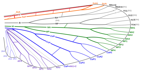 В исходном состоянии различают следующие продольные жилки: костальную (costa, или C); субкостальную (subcosta, Sc); радиальную (radius, R), снабжённую сзади ветвью — радиальным сектором (radii sector, RS); срединную (media, M), иногда делится на переднюю (MA) и заднюю (MP) ветви; кубитальную (cubitus, Cu), в числе двух, нередко сближенных жилок — передней (CuA) и задней (CuP); анальные (analis, A).