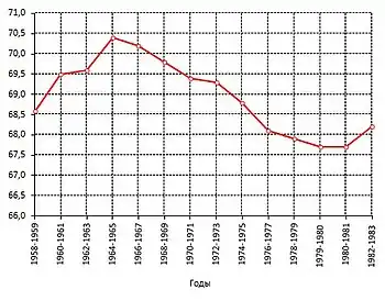 - ↑ Евгений АНДРЕЕВ. Ожидаемая продолжительность жизни 70 лет, или déjà vu отечественной демографии. Продолжительность жизни в СССР // Демоскоп Weekly : сайт. — 21 ноября - 4 декабря 2011. — № 487—488. Архивировано 15 февраля 2018 года.