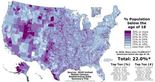По данным на 2021 год, суммарный коэффициент рождаемости в США составляет 1,84 рождения на женщину[8]. По состоянию на 2019 год средний возраст женщины при первых родах в США составляет 27 лет (для сравнения в Республике Корее стране с самым низким в мире СКР — 0,84 рождения на женщину на 2020 год, средний возраст женщины при первых родах в 2019 году составлял 32,2 года).[8][38][39]