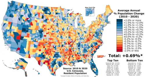 331 миллионов 449 тысяч 281 человек проживало в США, согласно Всеобщей переписи населения, в апреле 2020 года[5][6]. Это на 7,4 % больше, чем во время предыдущей переписи, прошедшей в 2010 году[7].