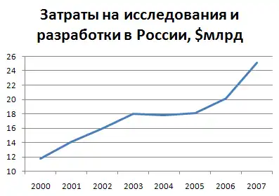 В 2008 году объём научных исследований и разработок в России составил 603 млрд рублей, в 2009 году — 730 млрд рублей[11].