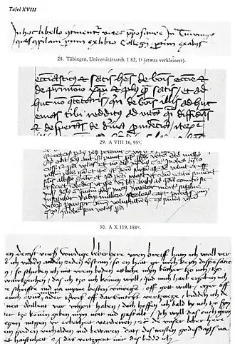 - ↑ Martin Steinmann. Die humanistische Schrift und die Anfänge des Humanismus in Basel // Archiv für Diplomatik, Schriftgeschichte, Siegel- und Wappenkunde. — Bd. 22. — Köln; Graz: Böhlau, 1976. — Tafel xviii.