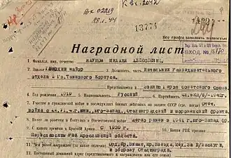 За проявленные мужество и геройство при форсировании реки Днепр в ночь с 23 на 24 сентября 1943 г., захвате села Великий Букрин, на правом берегу Днепра, точные разведданные о силах противника — представлен к званию Героя Советского Союза.