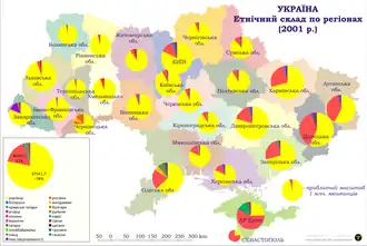 Большинство первого по численности национального меньшинства — русских (из 8 334,1 тыс. чел. на Украине в целом) — проживает в юго-восточных регионах страны. Наибольшую численность русские составляют в Донецкой области (1844,4 тыс.), Крымской АР (1 180,4 тыс.), Луганской области (991,8 тыс.), Харьковской области (724,0 тыс.), Днепропетровской области (627,5 тыс.), Одесской области (508,5 тыс.) и т. д.[2]