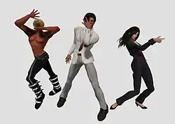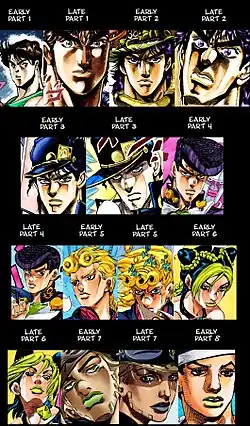Изображение главных героев каждой части франшизы JoJo , кроме восьмой и девятой (слева направо): Джонатан Джостар, Джорно Джованна, Дзётаро Кудзё, Джозеф Джостар, Джолин Кудзё, Джонни Джостар и Дзёсукэ Хигасиката
