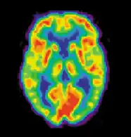Позитронно-эмиссионная томография (ПЭТ) измеряет выброс радиоактивно меченых метаболически активных химических веществ, введённых в кровеносное русло. Информация обрабатывается компьютером в 2- или 3-мерные изображения распределения этих химических веществ в головном мозге[7]. Испускающие позитроны радиоизотопы производит циклотрон и химические вещества маркируют радиоактивными атомами. Радиоактивно меченое образование, именуемое радиоактивный индикатор, вводят путём инъекции в кровеносное русло и в конечном счёте оно достигает головного мозга. Сенсоры в ПЭТ-сканере регистрируют радиоактивность, когда радиоактивный индикатор накапливается в разных структурах головного мозга. Компьютер использует информацию, собранную от сенсоров для создания 2- и 3-мерных разноцветных изображений, отражающих распределение индикатора в мозге. В настоящее врем нередко используются целые группы разнообразных лигандов для картирования различных аспектов активности нейромедиаторов. Тем не менее, наиболее часто используемым ПЭТ-индикатором остается меченая форма глюкозы (см. Фтордезоксиглюкоза (ФДГ)), показывающая распределение метаболической активности клеток головного мозга.