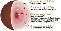 В нейтронной звезде можно условно выделить пять слоёв: атмосфера, внешняя кора, внутренняя кора, внешнее ядро и внутреннее ядро.