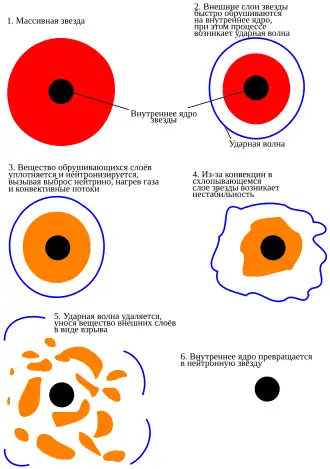Когда плотность звезды достигает ядерной плотности 4⋅1017 кг/м3, давление вырожденного нейтронного идеального газа Ферми — Дирака останавливает сжатие. Падение внешней оболочки звезды на нейтронное ядро останавливается, и она отбрасывается от ядра звезды потоком нейтрино, так как при очень высоких температурах в схлопывающейся оболочке вещество оболочки становится непрозрачным для нейтрино, при этом звезда превращается в сверхновую. После рассеивания внешней оболочки от звезды остаётся звёздный остаток — нейтронная звезда.