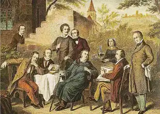 Теобальд фон Эр. «Веймарское придворное общество». Шиллер читает своё произведение в Тифуртском парке. Среди слушателей крайний слева — Виланд, перед ним — Гердер с женой, справа перед колонной стоит Гёте