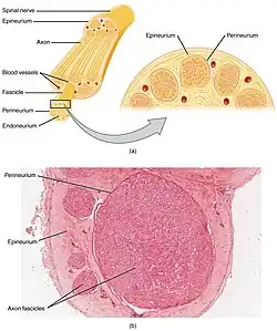 Периферический нерв состоит из нескольких пучков нервных волокон. Нервное волокно представляет собой длинный отросток нейрона — аксон, передающий нервные импульсы, покрытый оболочкой из шванновских клеток. Мякотные (миелинизированные) волокна, в отличие от безмякотных (немиелинизированных), окружены также и миелиновой оболочкой[4].