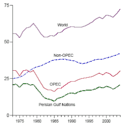 Мировая добыча нефти (верхняя линия) и отдельно добыча странами ОПЕК (красная линия), из них странами Персидского залива (зеленая линия) и прочими нефтедобывающими странами (синяя линия) в 1973—2004 гг.[35]
