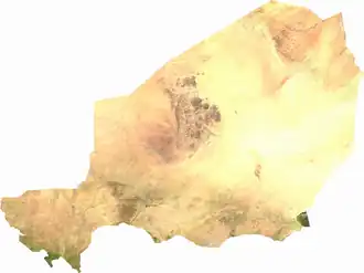 Республика Нигер расположена на северо-востоке Западной Африки. Граничит на севере и северо-западе с Алжиром, на северо-востоке — с Ливией, на востоке — с Чадом, на юге и юго-западе — с Нигерией, на юго-западе — с Бенином и Буркина-Фасо, а на западе — с Мали. Страна не имеет выхода к морю. Государство находится между 11°37′ и 23°33′ северной широты (1300 км с севера на юг) и 0°06′ и 16° восточной долготы (2000 км с запада на восток). Территория Нигера имеет площадь 1 267 000 км², занимая шестое место в Африке по площади (после Алжира, Демократической республики Конго, Судана, Ливии и Чада), а также являясь крупнейшим государством в Западной Африке[10].