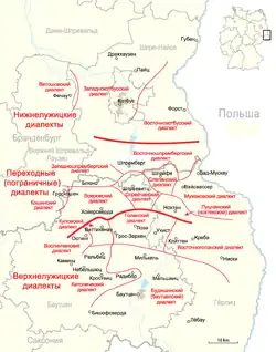 Согласно диалектологической карте лужицких диалектов, представленной в книге Г. Шустера-Шевца, нижнелужицкий диалектный ареал включает три диалекта[37]:
