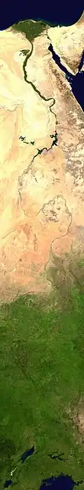 Река берёт начало на Восточно-Африканском плоскогорье и впадает в Средиземное море, образуя дельту площадью 24 тыс. км²[3]. Среднегодовой расход воды в устье Нила 2900 м³/с[4]. В верхнем течении принимает крупные притоки — Эль-Газаль (левый) и Асуа, Собат, Голубой Нил и Атбара (правые). Ниже устья правого притока Атбары Нил течёт по полупустыне, не имея притоков (кроме временных рек) на протяжении последних 3000 км[5].