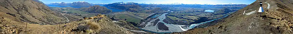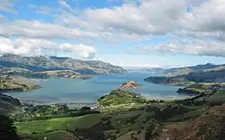 Южный остров — крупнейший остров Новой Зеландии и 12-й по величине остров на планете, его площадь составляет 150 437[19] км². На острове проживает примерно одна четвёртая часть населения страны. Вдоль острова с севера на юг тянется хребет складчатых гор Южные Альпы, самой высокой вершиной которых является гора Кука (43°35′44″ ю. ш. 170°08′27″ в. д., другое официальное название — Аораки) высотой 3724 м[20][21]. Кроме неё, на Южном острове есть ещё 18 вершин высотой более 3000 м. Восточная часть острова более равнинная и почти полностью занята сельскохозяйственными угодьями. Западное побережье острова заселено гораздо менее плотно. Здесь сохранились значительные массивы почти нетронутой природы с девственным растительным и животным миром. Западная часть знаменита также многочисленными национальными парками, фьордами и ледниками, спускающимися со склонов Южных Альп прямо в Тасманово море. Самое большое озеро острова — Те-Анау (второе по площади озеро Новой Зеландии).