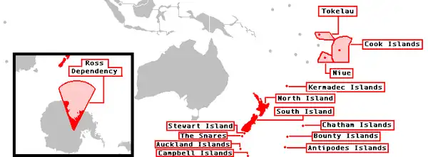Подразделяется на 17 районов, 9 из которых расположены на Северном острове, 7 на Южном острове, и 1 на Чатемском архипелаге. Королевство Новой Зеландии включает в себя независимые в государственном управлении, но свободно ассоциированные с Новой Зеландией островные государства Острова Кука и Ниуэ, а также несамоуправляющуюся территорию Токелау и антарктическую Территорию Росса.