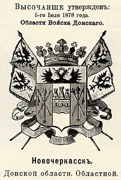 Герб Области Войска Донского, утверждён Всероссийским императором Александром II 5 июля 1878 года. Герб области имел следующее описание: «Щит, дважды рассечённый, с главою. В среднем серебряном поле, на лазуревом волнообразном поясе, червлёная зубчатая стена с тремя таковыми же зубчатыми круглыми башнями, из которых средняя выше. В правом червлёном поле, золотой пернач, за которым положены косвенно на-крест, серебряный бобылев хвост, на таковом же древке, и серебряная же насека — эмблемы, пожалованные Войску Донскому Петром Великим; в левом червлёном же поле, серебряная булава, за которою на-крест положены косвенно, серебряная насека, украшенная Императорским орлом и серебряный же бунчук на таковом же копье — эмблемы, пожалованные Войску Донскому Императрицею Елизаветою Петровною. В золотой главе щита, возникающий чёрный Императорский орёл, тремя коронами украшенный. Щит увенчан Древнею Царскою короною; за щитом, четыре Императорские знамени, соединённые Александровскою лентою».