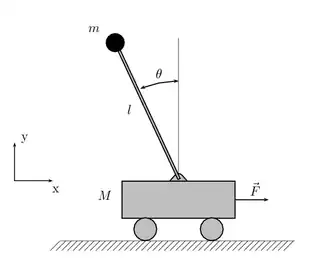 Уравнения движения могут быть получены с использованием уравнений Лагранжа. Речь идёт об приведённом выше рисунке, где угол маятника длиной по отношению к вертикали и действующей силе гравитации и внешних сил в направлении . Определим положение тележки. Лагранжиан системы: