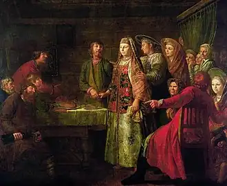 В обычном праве крестьянства конца XIX века это воззрение удерживается, во многих местностях, с полной силой. Главную силу брака крестьяне видят в гражданском договоре, сохранившем многочисленные остатки покупки невесты; договор заключается с символическими обрядами (рукобитье, литки и так далее) и обеспечивается неустойками, задатками и залогами; отказ от обручения считается делом бесчестным, долженствующим навлечь на виновного как небесную, так и земную кару, в виде взыскания расходов, даров, платы за бесчестье, а иногда — и уголовного наказания. Во многих местностях и теперь обручённые начинают вести брачную жизнь до венчанья. Церковное воззрение в Древней Руси приспособилось к народному в том смысле, что освящало церковным благословением обручения, совершавшееся часто задолго до заключения брака, и признавало его нерасторжимость; но решающий момент в заключении брака церковь видела в венчаньи, за укрепление которого в жизни церковь усиленно боролась.