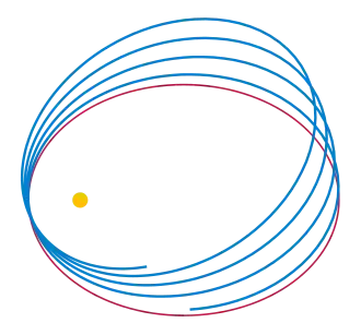 - Дополнительный сдвиг перигелия орбиты Меркурия по сравнению с предсказаниями механики Ньютона[62][63].