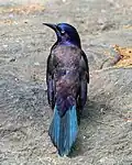Взрослые птицы достигают 32 см в длину. Самец имеет длинный тёмный клюв, бледно-жёлтые глаза и длинный хвост, его оперение радужно-чёрное, с пурпурным оттенком на голове. Взрослая самка немного меньше, в оттенке её оперения меньше радужного отлива, часто она тускло-коричневого цвета, иногда её можно принять за представителя другого вида.