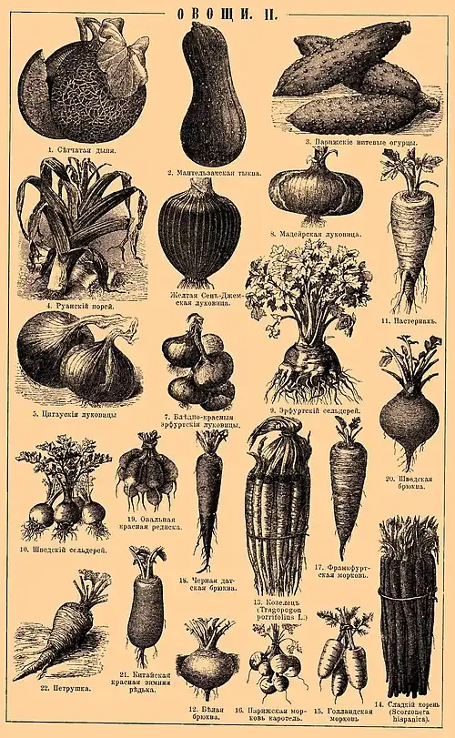 7. Овощи // Энциклопедический словарь Брокгауза и Ефрона : в 86 т. (82 т. и 4 доп.). СПб., 1890—1907. (Дата обращения: 16 ноября 2011)