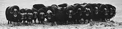 - 1 2 3 За проливом Лонга, на острове Врангеля | Публикации | Вокруг Света. www.vokrugsveta.ru. — «Встав в «каре», овцебыки подпускают противника на несколько десятков метров, затем из черной мохнатой стены молниеносно выскакивает один из самцов и, низко опустив голову, отгоняет непрошеного гостя, а затем вновь занимает место в строю сородичей. Такая тактика успешно работала против исконного врага — волка, но человеку с огнестрельным оружием она была только на руку. В XVIII — XIX веках в арктических районах североамериканского континента истребление овцебыков было поставлено на широкую ногу, и охота на них всегда считалась делом несложным и выгодным.» Дата обращения: 28 ноября 2019. Архивировано 27 ноября 2019 года.
