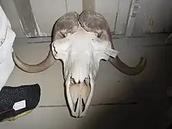 Череп имеет следующие отличительные черты: большая ширина в глазницах, почти ровная поверхность лба, вогнутый профиль лобно-лицевой части, небольшие костные слуховые барабаны, укороченность теменной части затылочной кости, низкие и широкие затылочные мыщелки[47]. Базальная длина черепа самца, в зависимости от подвида, составляет от 442 до 466 мм, скуловая — от 162 до 177 мм[11].