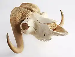 Голова овцебыков очень массивная и удлинённая[30], на голове имеются острые закруглённые рога с массивным основанием на лбу. Рога не сбрасываются ежегодно и растут до шестилетнего возраста[33], сначала загибаясь вниз, потом вперёд, далее вверх и наружу. Рога у самцов намного крупнее и массивнее, чем у самок. Самцы и самки используют рога для защиты от хищников, а самцы — также во время гона для боёв между собой[16]. У самок между рогами есть участок кожи, покрытый белым пухом[33], а сами рога не имеют утолщения у основания[32]. По бокам головы расположены тёмно-карие глаза[34].