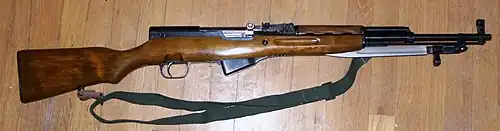 7,62-мм автомат Калашникова[13] (АК, индекс ГРАУ — 56-А-212, часто неверно[14] называют АК-47) — автомат, разработанный Михаилом Калашниковым с 1946 по 1947 год, принятый на вооружение Советской Армии в 1949 году.