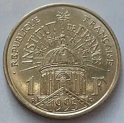 | 24 | 6 | Никель | ребристый | 1995 | 200 лет Институту Франции. Монетный двор — Париж. Тираж — 4 977 861 | |||