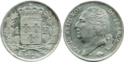 23 | 5 | Серебро 900 | 1816—1824 | Монетные дворы — Париж (A), Руан (B), Лион (D), Ла-Рошель (H), Лимож (I), Бордо (K), Байонна (L), Тулуза (M), Марсель (MA), Нант (T), Перпиньян (Q), Лилль (W). Тираж — 4 338 619 | |||