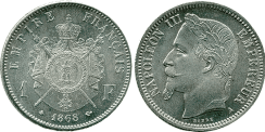 23 | 5 | Серебро 835 | ребристый | 1866—1870 | Портрет с лавровым венком. Монетные дворы — Париж (A), Страсбург (BB), Бордо (K). Тираж — 82 744 251 | ||