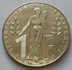 В январе 1960 года была проведена денежная реформа, введён «новый франк», равный 100 старым. Пробные монеты были изготовлены в 1959 году, а в 1960 году начат выпуск никелевых монет в один франк. Для новой монеты был выбран тип «Сеятельница», выполненный по рисунку Оскара Роти и использовавшийся ранее на монетах с 1898 по 1920 годы. С 1988 года периодически выпускались никелевые памятные монеты, а также памятные монеты из драгоценных металлов. Последние монеты этого номинала выпущены в 2001 году[10][11].