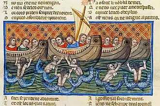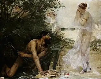 На этом острове Одиссей провёл, по данным Гомера, семь лет (Гигин пишет об одном годе[159], Аполлодор — о пяти годах, Овидий — о шести[160], Сервий — о десяти[161]). Калипсо делила с ним ложе, уговаривала стать её мужем и забыть Итаку, а взамен обещала бессмертие; но Лаэртид тосковал по дому и по своей семье[162]. Подолгу сидел он на берегу моря и вглядывался вдаль. Наконец, Зевс по просьбе Афины отправил на Огигию Гермеса в качестве вестника, и тот передал Калипсо приказ освободить гостя. Построив плот, Одиссей снова отправился в путь. После семнадцати дней спокойного плавания огромная волна, посланная Посейдоном, смыла путешественника в воду, но он смог выплыть и вернуться на плот. На помощь к нему пришла морская богиня Левкофея: она убедила Одиссея завернуться в подаренное ею чудотворное покрывало и снова прыгнуть в воду. Через два дня пловец, голый и выбившийся из сил, достиг берега острова Дрепана, принадлежавшего народу феаков. Он спрятался в роще у ручья и уснул[163][164][165][155][166].