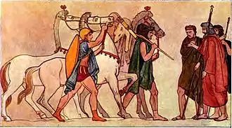 Взять Трою греки смогли благодаря деревянному коню, и эту хитрость большинство источников приписывает Одиссею. Именно царь Итаки придумал на время отвести армию (якобы окончательно уставшую от войны) и оставить в качестве подарка троянцам огромного деревянного коня, внутри которого должны были спрятаться самые храбрые из греков. Одиссей сам выбрал храбрецов и забрался в коня вместе с ними; его выбрали старшим[108]. Троянцы поверили, что враг ушёл, и затащили «подарок» в город. Когда вокруг коня ходила Елена, называя греков по именам и подражая при этом голосам их жён, именно Одиссей не позволил Менелаю, Диомеду и Антиклу отозваться (последнему он зажимал рот, пока Елена не ушла, и согласно поздней версии мифа даже задушил его)[109][110][111][112][103].