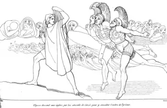 Потом Одиссей поговорил с душой матери, умершей от тоски по нему после начала Троянской войны. Антиклея рассказала, что Пенелопа ждёт мужа, проводя дни в печали, и что царский сан «никому от народа не отдан»[146]. Свою жажду утолили тени многих знаменитых женщин: Тиро, Антиопы, Ифимедеи и других. После них к жертвенной крови слетелись души товарищей Одиссея по Троянской войне. Агамемнон рассказал ему об обстоятельствах своей гибели и посоветовал причалить к Итаке тайно, чтобы избежать опасностей; Ахилл выслушал рассказ о великой славе его сына, Неоптолема. Аякс Теламонид, помнивший спор об оружии, не стал подходить к Одиссею, а Геракл посочувствовал Лаэртиду в его бедствиях[147]. Царь Итаки хотел дождаться других великих героев — Тесея и Пирифоя, но услышал крики и испугался, что Персефона вышлет против него из мрака голову Медузы Горгоны, а потому спешно вернулся на корабль и уплыл[148][143][145].