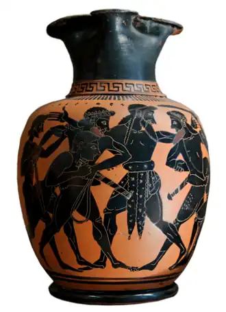 Одиссей участвовал вместе с Аяксом Теламонидом в схватке над телом Ахилла[85] и, согласно Диктису Критскому, убил при этом двух сыновей Приама — Арета и Эхеммона[86]. Квинт Смирнский перечисляет ещё нескольких знатных троянцев, убитых Одиссеем в этом бою; сам царь Итаки был ранен в колено, но не отступил[87]. Согласно Антисфену, Аякс отстоял в схватке тело Ахилла, а Одиссей — его оружие. Сам Аякс у того же автора утверждает, будто Одиссей осознанно выбрал для защиты менее ценную добычу. Однако Софокл и Овидий уверены, что царь Итаки спас от врага и оружие, и тело Ахилла[88][89][90][91].