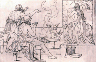 ![]() Одиссей, получающий наставления Тиресия, Краснофигурная роспись на кратере. IV век до н. э. | |