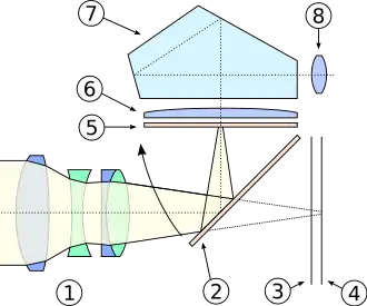 Часть современной зеркальной аппаратуры с квадратным кадром 6×6 сантиметров сохранила возможность визирования через шахту, но гораздо чаще изображение рассматривается через оборачивающую систему, позволяющую держать фотоаппарат на уровне глаз. Для получения в окуляре 8 прямого изображения чаще всего используется крышеобразная пентапризма 7. В упрощённой версии зеркального видоискателя вместо пентапризмы может использоваться более дешёвая призма Порро. Такая конструкция применялась, в частности, в любительских фотоаппаратах серии Nikkorex-35 и в полуформатных Olympus Pen F[87]. В некоторых среднеформатных фотоаппаратах, например в советском «Киев-88 TTL», пентапризма заменяется более компактной трёхгранной призмой с крышей и двойным отражением, а окуляр располагается под углом.