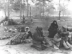 Когда люди заходили в лагерь, многие вздыхали с облегчением. Все настолько устали, а здесь поняли, что все, больше идти никуда не нужно. Помню, как со всех сторон слышался треск ломающихся веток, люди стелили ветки и тут же падали на них. Что из себя представлял лагерь? Это территория, на которой не было никаких построек, заболоченное мелколесье. Все окружено забором в 5 или 6 рядов колючей проволоки. По углам вышки с часовыми. …костры палить не разрешалось, рубить ветки деревьев тоже, хотя топоров у нас все равно не было. Попав в лагерь, люди старались найти место повыше и посуше, но это было сложно. Голод был страшный. Хлеб за время нашего там пребывания привезли только один раз. Называется он эрзац, горький, сделан, как позже выяснилось, из березовых опилок и овсяной муки. К ограждению подъезжал грузовой автомобиль, и немцы из кузова бросали этот хлеб нам: кто мог — схватил, кто — нет. Воду пили из проталин, здесь же кругом лежали трупы умерших людей. Земля почти везде была покрыта жидкой фекальной массой.