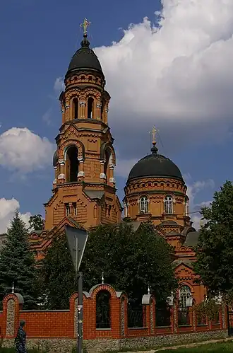 Храм по проекту Владимира Немкина выполнен из красного неоштукатуренного кирпича в эклектичных формах византийско-русского стиля. Боковые апсиды в виде трёхгранников слегка выступают из плоскостей северной и южной стен, подчёркивая полукруглую апсиду главного алтаря в честь Озерянской иконы Пресвятой Богородицы. Фасады здания насыщены архитектурными деталями, заимствованными из древнерусского культового зодчества. Массивному, квадратному в плане, четырёхстолпному объёму церкви, увенчанному световым барабаном со сферическим куполом, противопоставлена стройная четырёхъярусная колокольня (около 40 метров), соединённая с западным притвором. Расположенная на возвышенном месте, органично завершая силуэт высокого плато Холодной горы, церковь благодаря своему изящному силуэту играла доминирующую роль в застройке западной части города как один из главных элементов панорамы района со стороны исторического центра города.