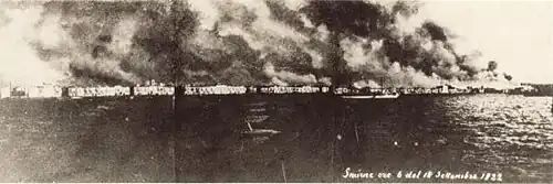 9 сентября в Смирну вступила турецкая армия Мустафы Кемаля. Согласно свидетельству американского консула Джорджа Хортона 9 сентября, когда в город вступили турки, прошло относительно спокойно: ещё утром в городе поддерживала порядок греческая жандармерия, которая передала свои функции вступившим турецким войскам. После вступления турецких войск в город 9 сентября 1922 года началась резня греческого и армянского населения. Греческие и армянские кварталы охватили пожары. Мустафа Кемаль заявлял французскому адмиралу Дюменилю: «Мы знаем, что существовал заговор. Мы даже обнаружили у женщин-армянок всё необходимое для поджога… Перед нашим прибытием в город в храмах призывали к священному долгу — поджечь город». Французская журналистка Берта Жорж-Голи, освещавшая войну в турецком лагере и прибывшая в Смирну уже после событий, писала: «Кажется достоверным, что, когда турецкие солдаты убедились в собственной беспомощности и видели, как пламя поглощает один дом за другим, их охватила безумная ярость и они разгромили армянский квартал, откуда по их словам появились первые поджигатели». Город был полностью сожжён, в пожаре погибли сотни домов, 24 церкви, 28 школ, здания банков, консульств, больницы[13][14][15][16][17]. Количество убитых в разных источниках варьируется от 60 тысяч[13] до 260 тысяч; согласно Р. Руммелю[15], средняя цифра составляет 183 тысячи греков и 12 тысяч армян[17]. По подсчётам Жиля Милтона, в резне погибли 100 000 человек, ещё 160 000 мужчин было депортировано во внутренние области Анатолии, и большинство их погибло в дороге[16].