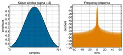 где — модифицированная функция Бесселя первого рода нулевого порядка; — коэффициент определяющий долю энергии, сосредоточенной в главном лепестке спектра оконной функции. Чем больше тем больше доля энергии, и шире главный лепесток, и меньше уровень боковых лепестков. На практике используются значения от 4 до 9.